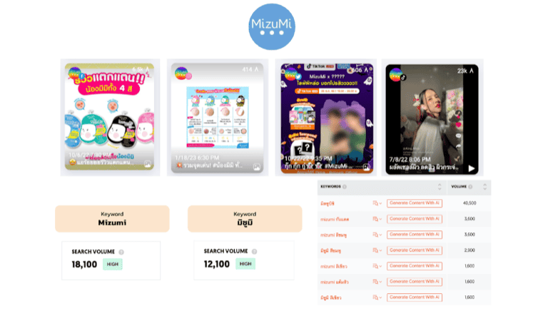 แบรนด์ Mizumi ที่มีชื่อเสียงมาจากครีมกันแดด เห็นได้จากการค้นหาชื่อแบรนด์มักมีการค้นหาคู่กับผลิตภัณฑ์กันแดด ซึ่งได้มี Presenter เป็นคุณใบเฟิร์น แต่ก่อนหน้านี้เมื่อปี 2564 ที่เน้นโปรโมตผลิตภัณฑ์เกี่ยวกับรักษาสิวหรือรอยแผลมี Presenter คือคุณอัพ ภูมิพัฒน์ ซึ่งแบรนด์เน้นโปรโมตผลิตภัณฑ์ขนาดเล็กที่ขายใน 7-11 ชื่อว่าน้องมิมิ แต่ในช่วงหลังแบรนด์ไม่ได้เน้นผลิตภัณฑ์เฉพาะรักษาสิวมากนัก
