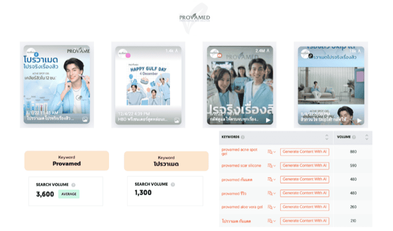 แบรนด์ Provamed มีผลิตภัณฑ์ดูแลเรื่องผิว ทั้งครีมกันแดด ดูแลสิว รอยแผลเป็น ฝ้า กระ และมีคุณกลัฟ คณาวุฒิ เป็นพรีเซนเตอร์กลุ่มผลิตภัณฑ์ดูแลสิว ผ่าน Key Message โปรวาเมด โปรจริงเรื่องสิว ซึ่งการสื่อสารไม่ได้เน้น Product Benefit มากนัก แต่เน้นการใช้ภาพ Presenter ทำให้ส่วนใหญ่ผู้ใช้งานไม่ได้กล่าวถึงตัวผลิตภัณฑ์ แต่เป็นการแสดงความชื่นชอบ Presenter