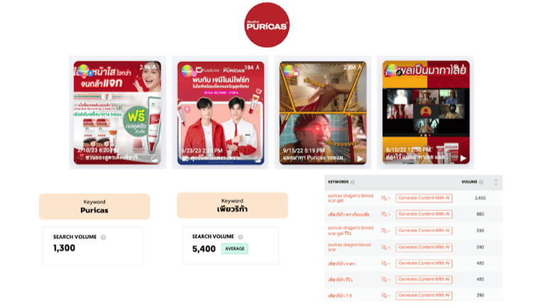 แบรนด์ Puricas มีผลิตภัณฑ์เฉพาะเจาะจงด้านการรักษารอยแผลเป็น หรือลดรอย ไม่ได้มีผลิตภัณฑ์หลากหลายเหมือนแบรนด์อื่น ทำให้ Search Volume น้อย และการค้นหาจะระบุถึงตัวผลิตภัณฑ์ชื่อดังคือ ดราก้อนบลัด ซึ่งในช่วงต้นปี 2566 ที่มีการเก็บข้อมูล ยังไม่มี Presenter แต่เน้นใช้ KOLs ทั้ง Gemini Fourth, Ice Padie และ วอร์ม วนรัตน์