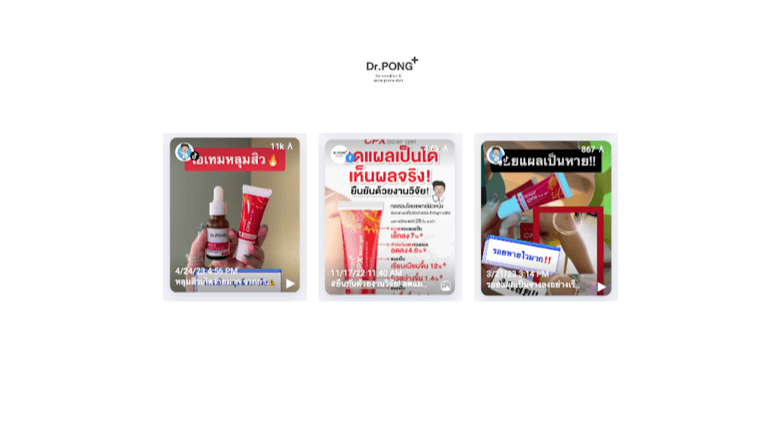 พบว่าที่น่าสนใจของแบรนด์มีการใช้เภสัชกรมาโปรโมตใน TikTok เพื่อการันตีความน่าเชื่อถือ ทำให้ผู้ใช้งานสนใจในตัวผลิตภัณฑ์ เนื้อหาเน้นเรื่องคุณสมบัติ บอกระยะเวลาจางของรอยแผลพร้อมการันตียอดขายอันดับ 1