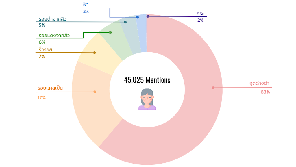 ส่วนริ้วรอย ส่วนใหญ่เป็นภาวะริ้วรอย อย่างรอยตีนกา ริ้วรอยเหี่ยวย่น ริ้วรอยใต้ตา ซึ่งอาจเป็นไปตามวัย ส่วนรอยแดงจากสิว รอยดำจากสิว มีสัดส่วนการกล่าวถึงที่ใกล้เคียงกัน โดยเป็นรอยที่เกิดหลังจากเป็นสิวที่หากไม่ได้ปล่อยทิ้งไว้นาน แล้วมีการรักษาหรือใช้ผลิตภัณฑ์ที่ช่วยรักษาได้ทัน อาจไม่ก่อให้เกิดรอย หรือหายได้ไวขึ้น