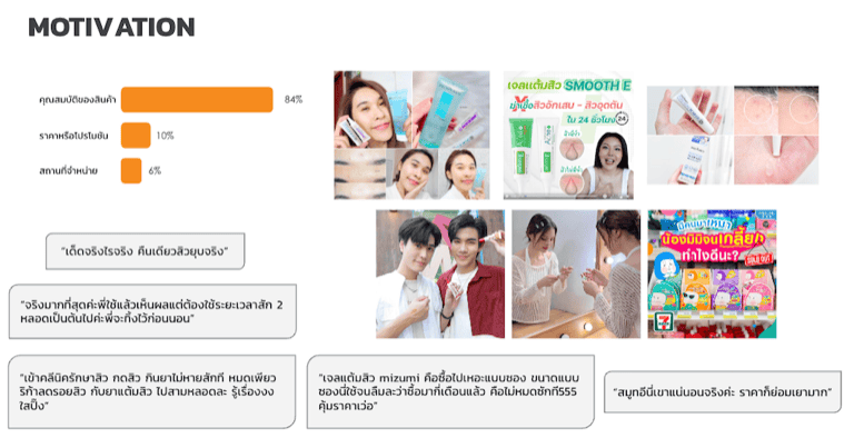 เห็นได้ชัดเจนว่าผู้บริโภคที่สนใจสกินแคร์นั้นต้องการสกินแคร์ที่ช่วยเรื่องสิว หรือลดรอย จึงเป็น Case Study ต่อมาคืออยากทราบแรงจูงใจที่ผู้บริโภคตัดสินใจซื้อสกินแคร์รักษาสิว หนึ่งในสกินแคร์ที่เป็นตัวช่วยในการลดการเกิดสิว รวมถึงลดรอยสิวหรือรอยแผลเป็น